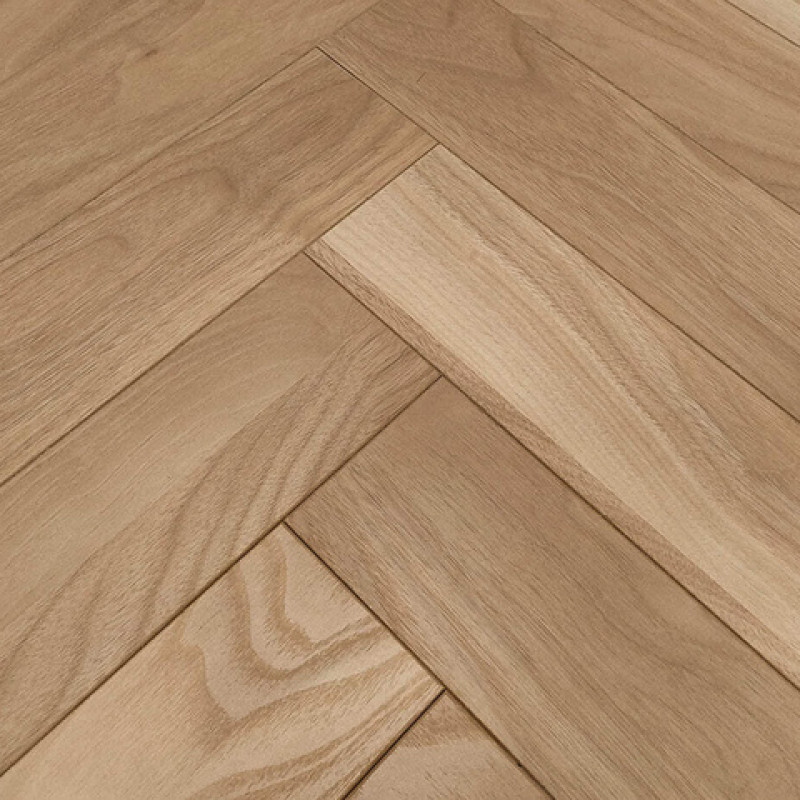 Ламинат Орех Принстон выполнен в теплом, натуральном оттенке светлого американского ореха с мягкими цветовыми переходами и выразительной древесной структурой. Классический рисунок укладки английская ёлочка создает динамичный и объемный узор на полу, который визуально обогащает пространство и придает ему аристократичный вид. Четырехсторонняя фаска на каждой планке дополнительно подчеркивает геометрию укладки, делая пол неотличимым от дорогого штучного паркета.