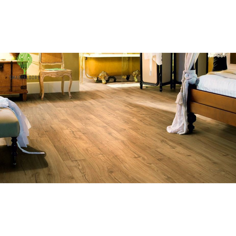 Quick-Step Impressive IM 1848 — ламинат с реалистичной текстурой натурального дуба и высокой устойчивостью к влаге. Уникальное водоотталкивающее покрытие фаски полностью предотвращает проникновение воды в стыки, обеспечивая защиту до 72 часов. Подходит для использования даже в помещениях с повышенной влажностью — гарантия 15 лет на укладку во влажных зонах.