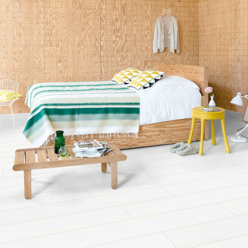 Ламинат Quick-Step Impressive IM 1859 Белоснежный — влагостойкий ламинат 33 класса с эффектом натурального дерева в современном светлом тоне. Благодаря технологии HydroSeal стыки надёжно защищены от влаги до 72 часов, что делает покрытие идеальным для кухни, ванной и прихожей. Поверхность с глубокой текстурой дерева создаёт ощущение настоящего паркета, а светлый цвет визуально расширяет пространство и добавляет интерьеру лёгкости.