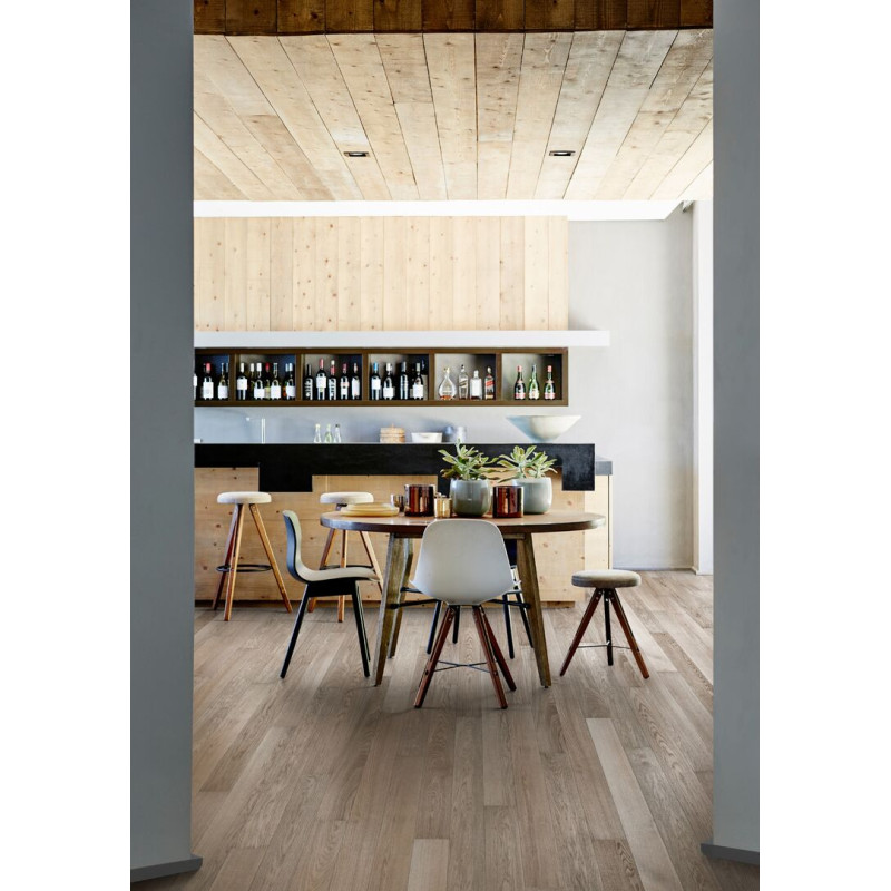 Однополосная доска в светлых тонах с микро-фасками. Поверхность обработана щеткой и покрыта полупрозрачным белым матовым лаком.