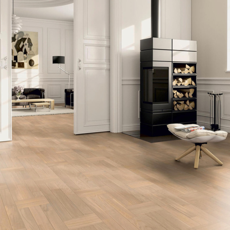Трехполосная паркетная доска со специальными фасками из коллекции «Contours» создают неповторимый рисунок пола. Фаска подчеркивает каждую ламельку, из которой состоит паркетная доска, и создает неповторимый рисунок. Обработка щеткой и натуральным маслом дополнительно подчеркивают каждую доску. Результат - высококонтрастные акценты и эксклюзивный рисунок.